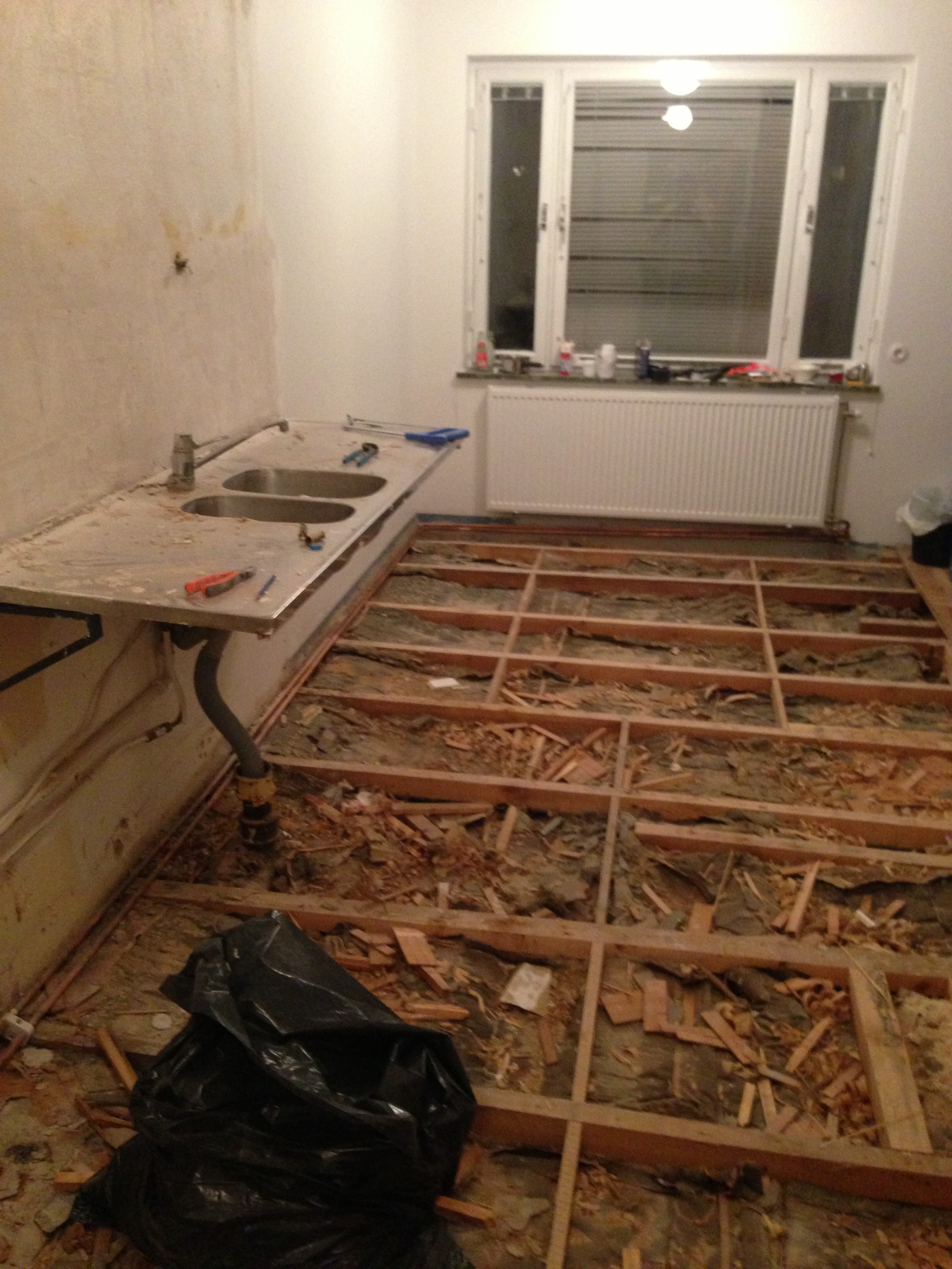 Ursprungligt golv var ett självbärande parkettgolv med struktur av industriparkett. Dock har ofta detta golv med tiden blivit sjavigt då det är tunt och glest reglat. Vid renovering av golvet kan man passa på och sätta dit några extra kortlingar och ny isolering.