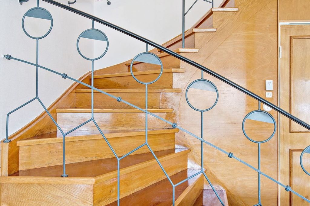 Trappan med det typiska trappräcket “lekande barn” tillhör interiör som föreningen önskar bevara. Som bättringsfärg rekommenderas Humbrols sortiment med hobbyfärg. Små burkar i många olika kulörer finns på bla Slöjddetaljer.