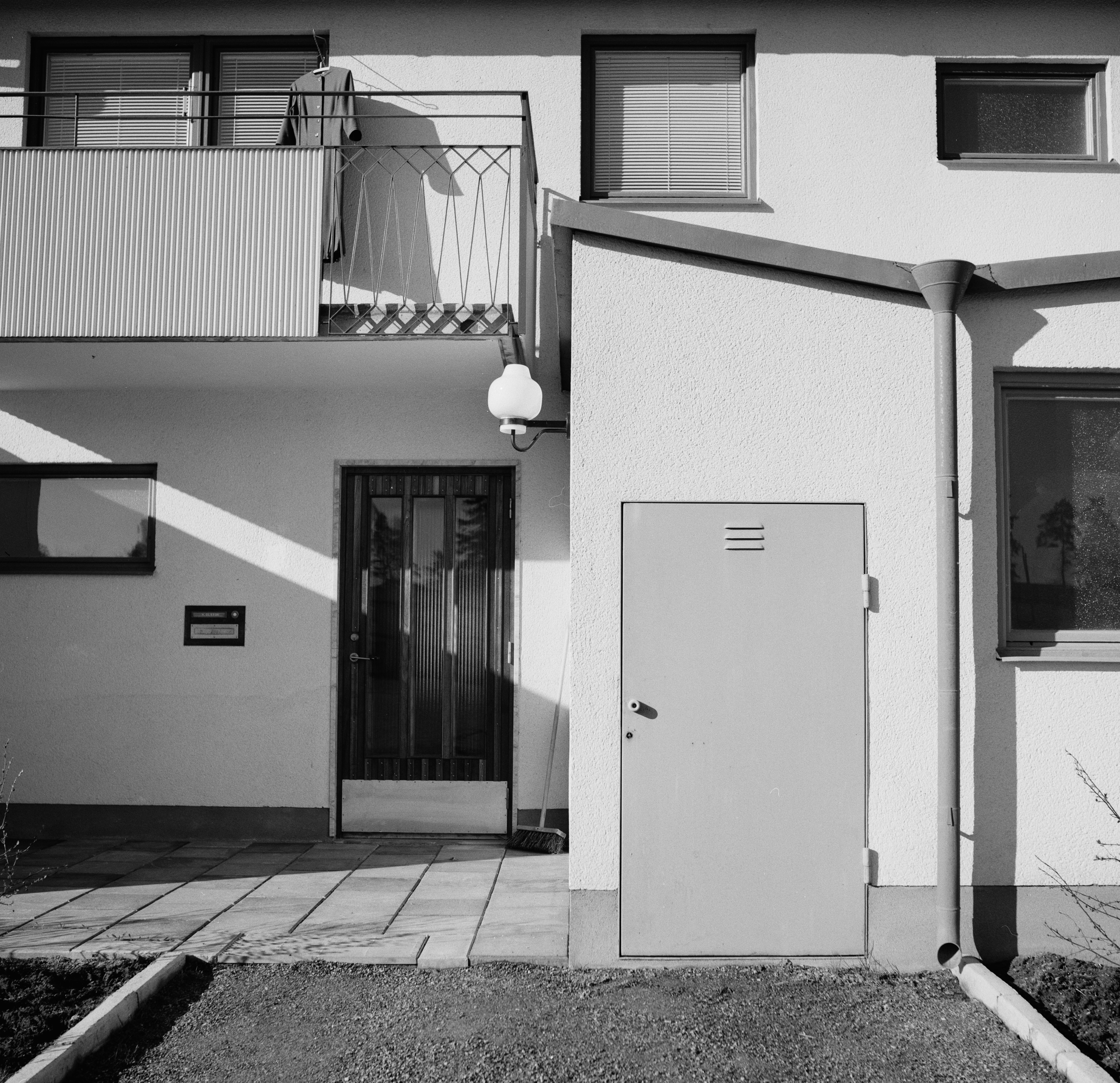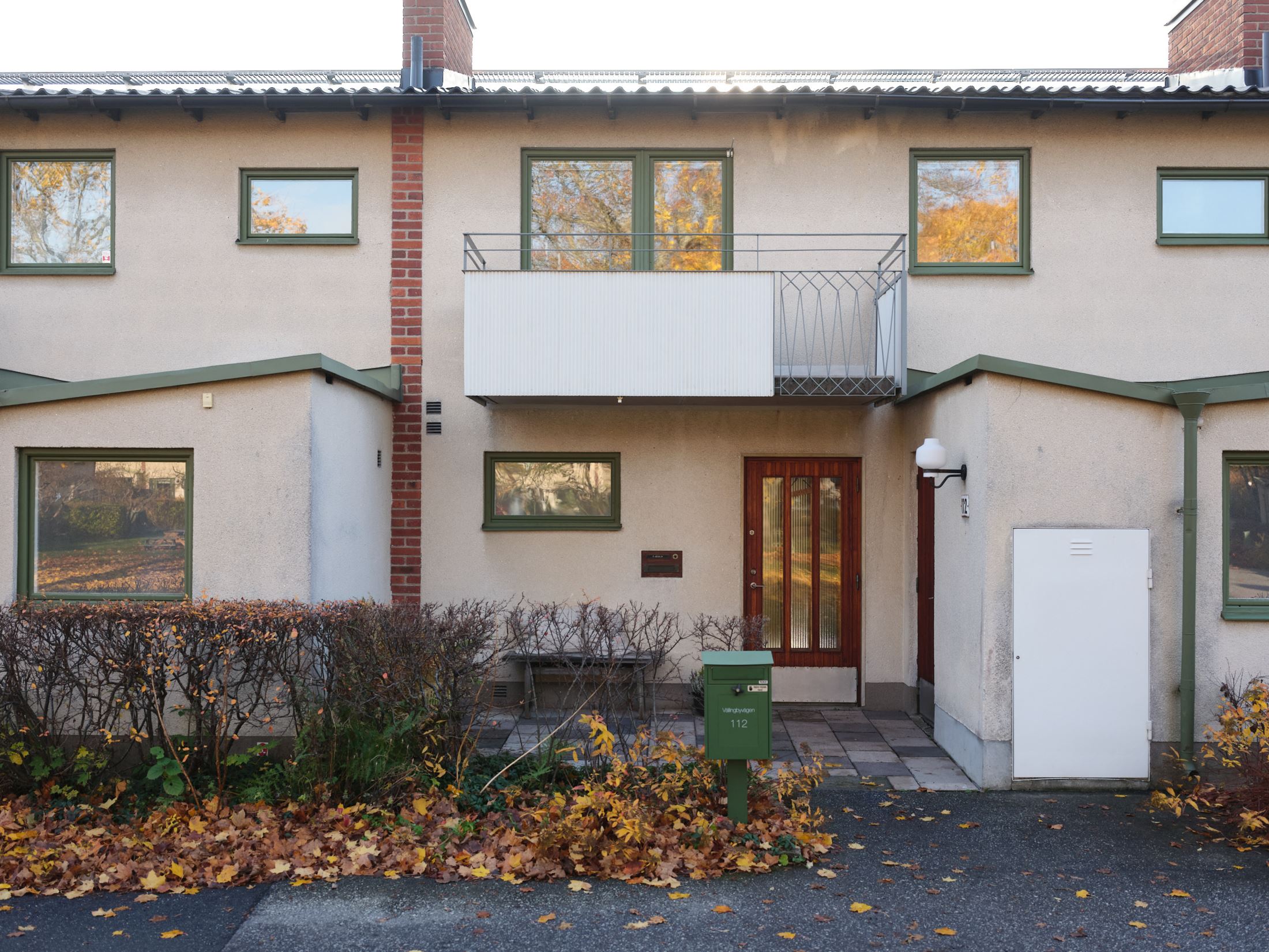Balkongen, eller snarare entrétaket, är tidstypiskt utformat och en viktig komponent i radhusens särprägel. Balkongplattor gjöts om om räcken renoverades 2012. Balkongens sinuskorrigerade plåt är målad i Vit 0502-Y och smide i Grönaktigt grå 4502-G. Bättringsfärg finns i pannrummet. Tvätta sommartid och skotta vintertid för att ta bort algpåväxt och förhindra rostangrepp.