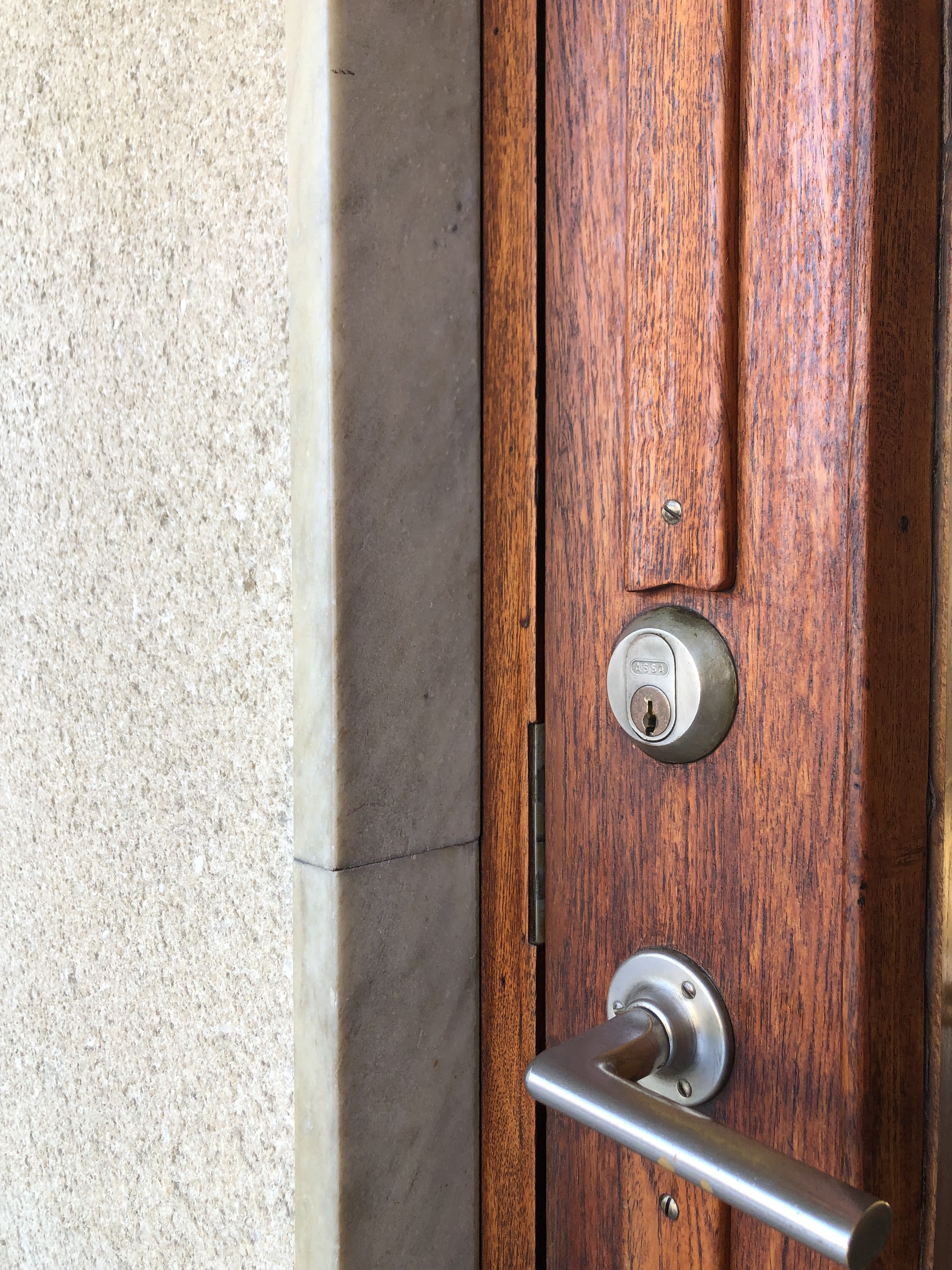 Portomfattning i marmor. Samma underhållsråd som för fönsterbänkar, undvik sura rengöringsmedel.